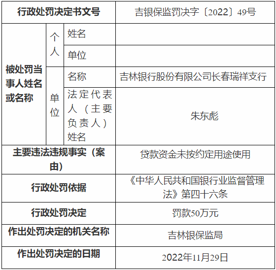 晨报讯:吉林银行长春瑞祥支行因贷款资金未按约定用途使用被罚款50万元 2022年12月更新